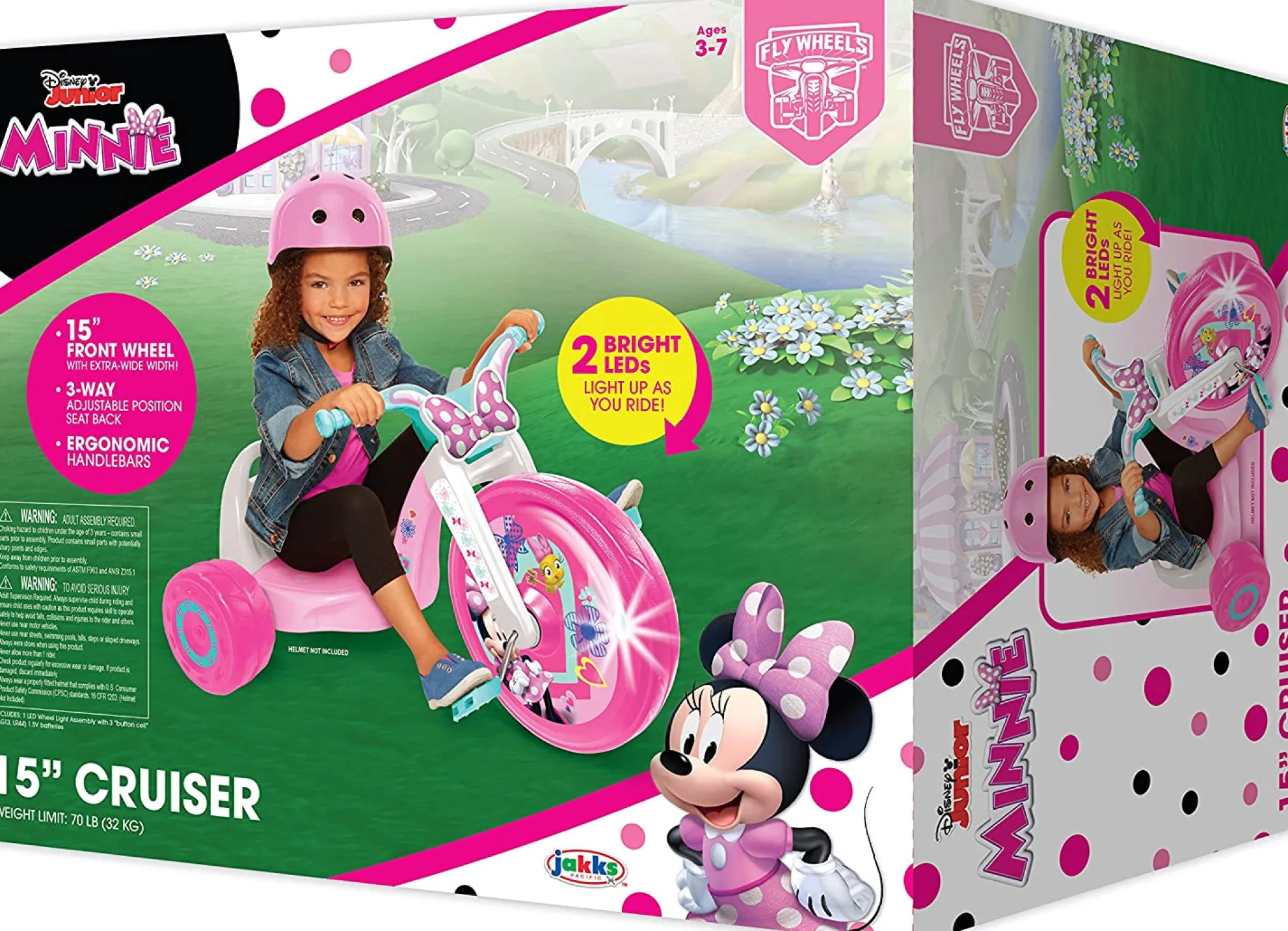 Get Ready To Roll With Fly Wheels. Zip Around The Neighborhood With Your Favorite Character Graphics. Let The Led Lights On The Front Wheel Whirl As Your Drive. Fly Wheels Encourage Your Child To Get Outside And Exercise With Endless Rip-Roaring Potential. The Low-Riding Design Creates Easy Off And On Access With A Low Center Of Gravity For Security And Comfort. Designed With An Oversized 15” Front Wheel, Your Little One Will Be Riding In Style. The 15” Fly Wheel Includes 3 Adjustable Seat Positions Which Fit Your Child’S Growth Needs. Always Have Your Child Wear A Helmet. (Helmet Not Included). Adult Assembly And Supervision Required. Stickers To Be Applied During Assembly. Ride-On Dimensions: 20 In X 22.5 In X 32.83 In. Weight Limit 70 Lbs. Warning: Adult Assembly Required. Choking Hazard To Children Under The Ages Of 3 Years – Contains Small Parts Prior To Assembly. This Exciting New Pedal Powered Ride-On Is For Kids Ages 3-7. Happy Riding.